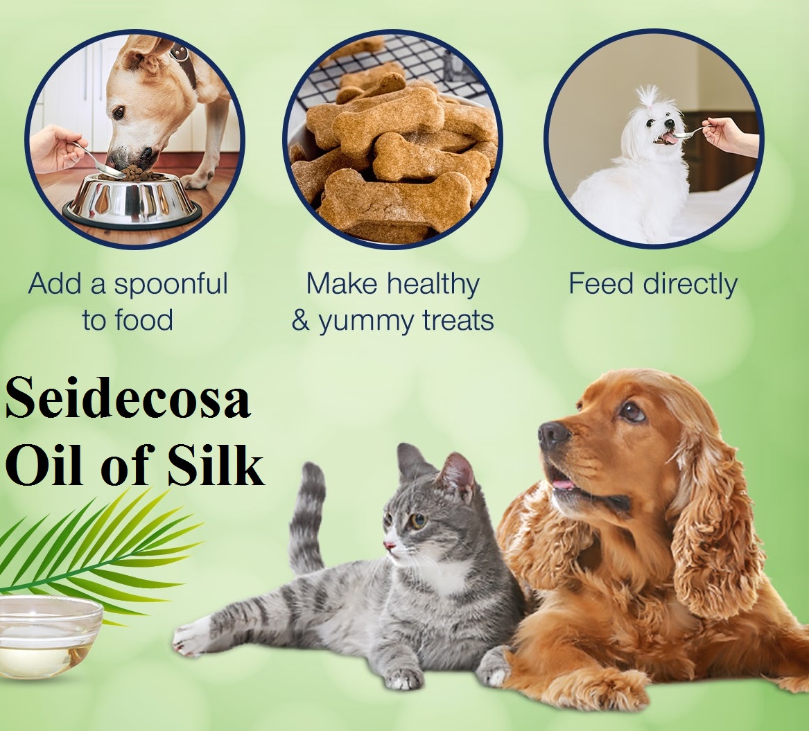 SeidecosaTM Oil of SilkTM is especially formulated to maintain the health of pets, specifically their skin, fur, and nails. Our oil helps to provide strength and elasticity to the hair shaft while also promoting overall hydration and shine, thus making them less prone to dry, brittle hair or excessive shedding. Additionally, SeidecosaTM Oil of SilkTM has made a mission to take care of fur babies by healing wounds, cuts, and abrasions on their skin by forming a protective barrier and faster tissue regeneration. Veterinarians often recommend protein-rich diets or supplements for pets with specific dermatological issues or those in need of extra support for their skin and coat health and SeidecosaTM oil is proven to perfectly fit the profile.